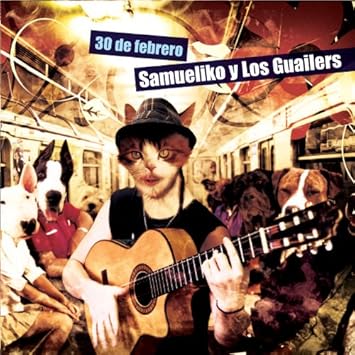 列車内でアクースティック・ギターを弾くネコ男。両側の座席に坐っている乗客たちもウシ女やイヌ男‥‥獣頭人身の異形者たちだが、特殊メイクや着ぐるみ仮装などではなく、写真の合成コラージュである。ブックレット(歌詞カード)の裏表紙にも同じくコラージュしたネコ顔のメンバー6人がギターやベースを弾き、ドラムを叩いている。表カヴァのネコ男がリ ーダーのSamuelikoで、裏のネコ男たちがLos Guailersなのだろう。Samueliko Y Los Guailersはスペイン・バルセロナで活躍するミクスチャー系ルンバ・ロック・バンド。サルサ、スカ、ロック、ヒップホップ、ファンク、サンバ、ルンバ、レゲエ、フラメンコなど、雑多な音楽を撹拌、咀嚼した陽気で騒がしいサウンド(スペイン語歌詞)はMano NegraやManu Chaoに通底するものがある(某クリアランスセールで見つけた掘り出し「ネコード」です)。